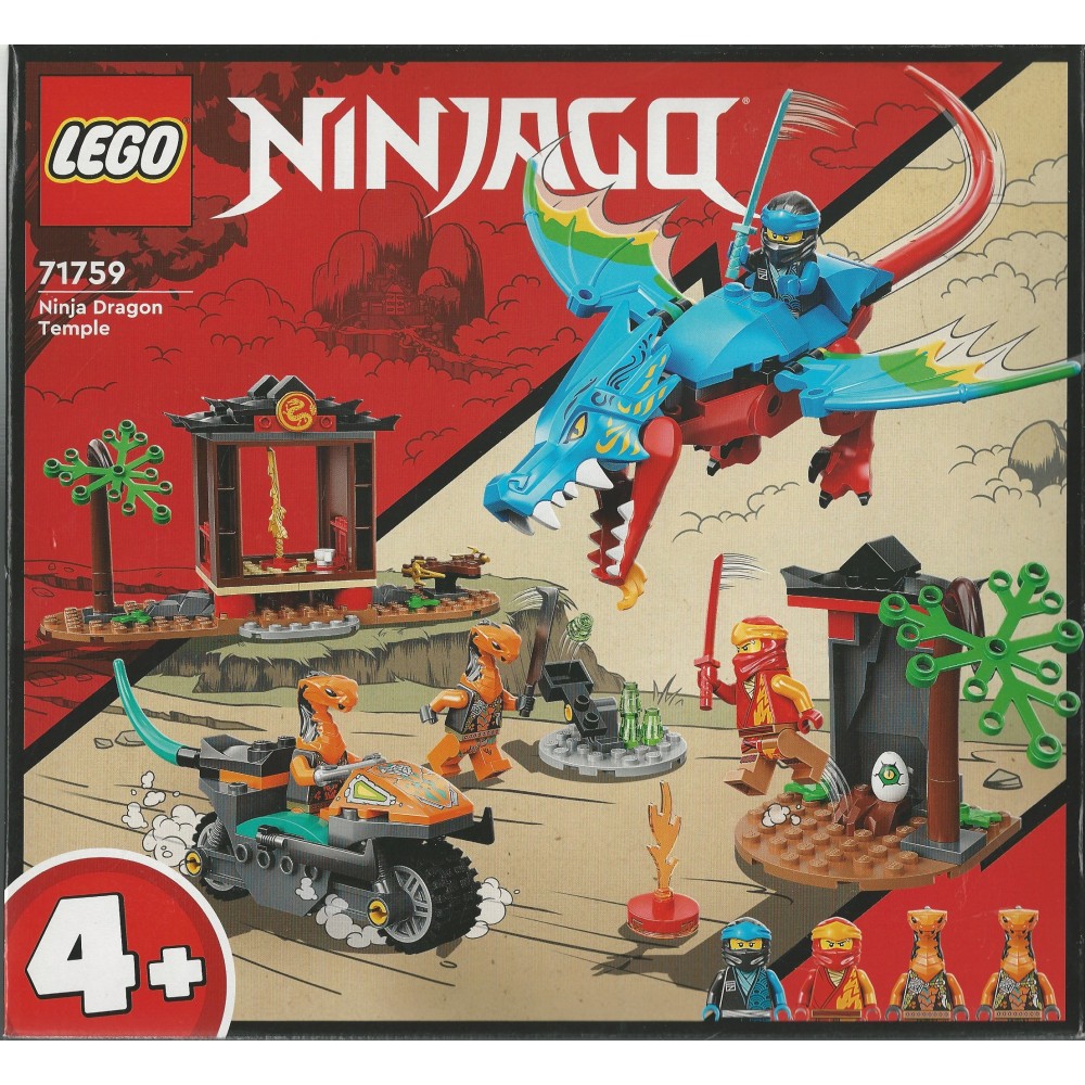 The set features a posable dragon, 2 ninja temples, 2 posable trees, a dragon’s egg and 4 minifigures: ninja Kai and Nya, and baddies Cobra Mechanic and Sneaky Snake.