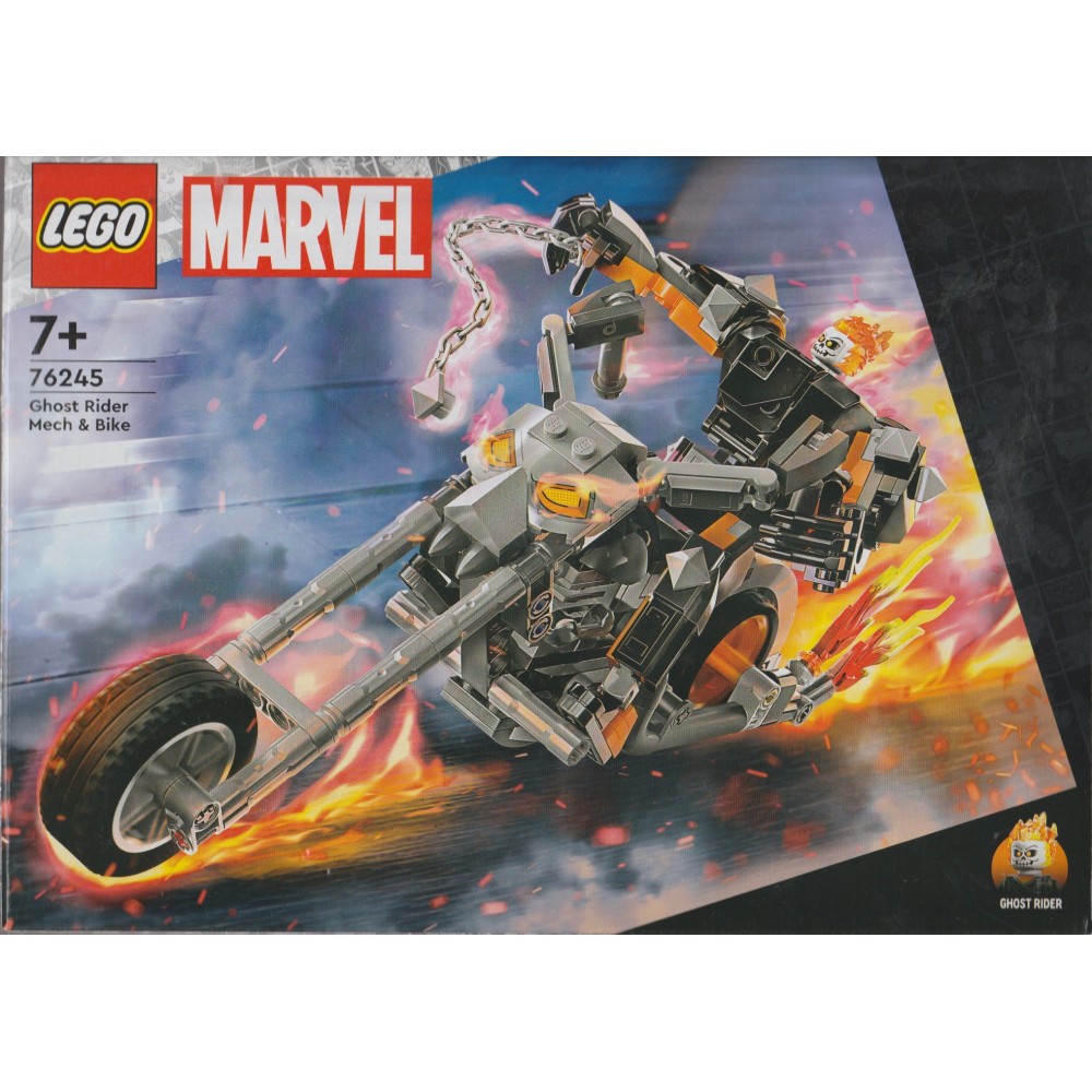 place the Ghost Rider minifigure into the opening cockpit of the Ghost Rider mech. The jointed mech has movable arms, legs and hands, allowing it to be positioned and posed for endless play-and-display possibilities. An attachable chain inspires imaginative action as kids take the supersized mech for a ride in search of bad guys. The bike stands upright unaided and features exhaust flames and a seat element that ensures the mech remains in the saddle when on the move.
