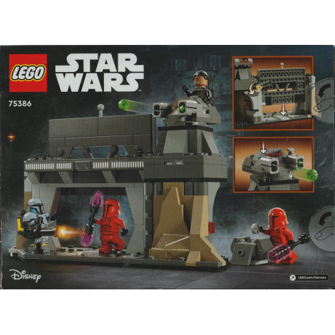 Questo set contiene una base mandaloriana con una porta blindata e meccanismo di chiusura, pannelli di controllo e una torretta girevole spara-bottoncini. Ci sono anche 4 minifigure per riprodurre il faccia a faccia tra Paz Vizsla e Moff Gideon (con armatura di Dark Trooper) e le Guardie Pretoriane Imperiali, oltre ad accessori come il jetpack di Moff Gideon e una scatola contenente un elemento detonatore termico.