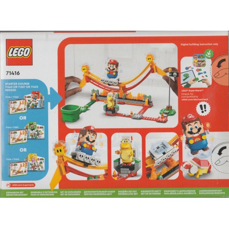 Il pack contiene un’onda di lava oscillante con una piattaforma lavica su cui far salire il personaggio di Mario, Luigi o Peach (PERSONAGGI NON INCLUSI ). I giocatori guadagnano monete digitali se rimangono sull’onda in movimento e sconfiggono i 2 Fiammetti a ogni estremità. Il set, ideale per il gioco sociale, include anche un Fuoco Bros da sconfiggere.
